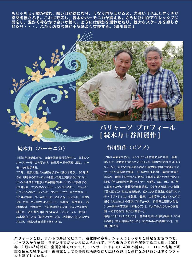 パリャーソとは、ポルトガル語でピエロ、道化師の意味。ジャズにしっかりと軸足をおきつつも、ポップスから童謡・ラテンまでジャンルにとらわれず、古今東西の名曲を演奏する二人組。2001年12月の結成以来、全国各地でのライブ、コンサートはすでに400本近い。ヨーロッパ各地で研鑽を積んだ続木と作・編曲家としても多彩な活動を繰り広げる谷川との粋なかけあいは多くのファンを魅了している。
